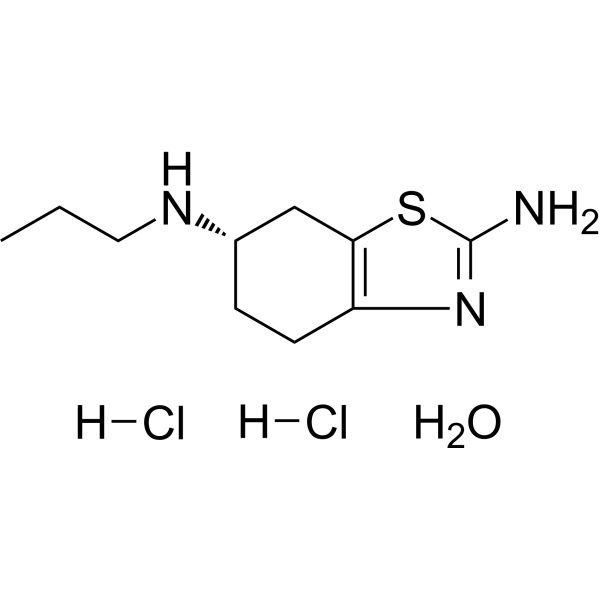 Le dichlorhydrate de pramipexole monohydraté (CAS : 191217-81-9) est un antihistaminique. Il est principalement utilisé en clinique pour traiter la maladie de Parkinson et son syndrome. Il peut être utilisé seul ou en association avec la Lévodopa. Le dichlorhydrate de pramipexole monohydraté est un agoniste sélectif et pénétrant de la barrière hémato-encéphalique (BBB) des récepteurs de dopamine de type D2-, avec un Kis de 2,2 nM, 3,9 nM, 0,5 nM et 1,3 nM pour les récepteurs de type D2-, D2, D3 et D4, respectivement. Le dichlorhydrate de pramipexole hydraté peut être utilisé pour la recherche sur la maladie de Parkinson (MP) et le syndrome des jambes sans repos (SJSR).