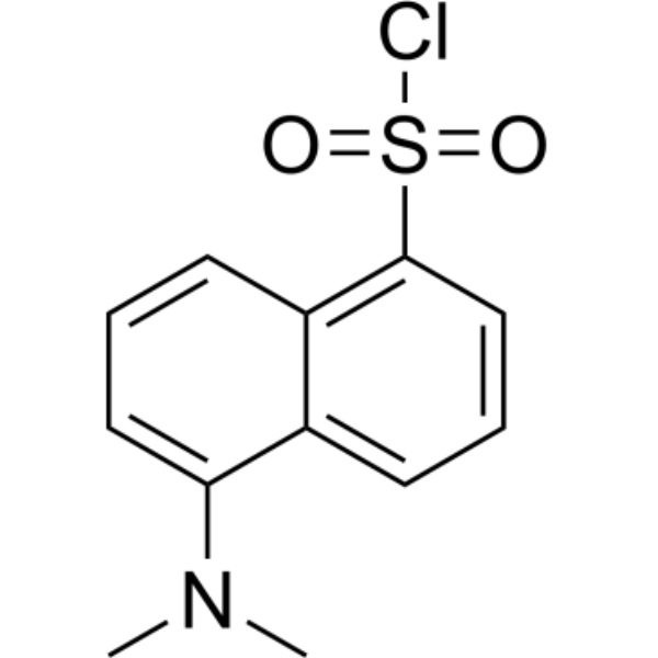 Le chlorure de dansyle (DNSCl) (CAS : 605-65-2) est un réactif fluorogène utilisé pour la détection des protéines, des acides aminés N-terminaux et des peptides par chromatographie liquide haute performance (HPLC) en phase inverse. Il est également utilisé pour déterminer le degré de marquage de la chymotrypsine et de l'ovalbumine. Il agit comme précurseur pour la synthèse d’autres dérivés comme le dansylamide. Le chlorure de dansyle n'est pas fluorescent jusqu'à ce qu'il réagisse avec les amines. Les Dansylamides résultants ont des rendements quantiques de fluorescence et des maxima d'émission sensibles à l'environnement ainsi que de grands déplacements de Stokes. Cette propriété de fluorescence sensible à l'environnement a fait du chlorure de dansyle un outil important pour les études biophysiques.
