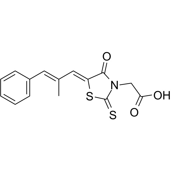 | Synonymes | Épaliste ; ONO-2235; Abeth ; Kinedak ; Sorbistat; (5Z)-5-[(2E)-2-Méthyl-3-phényl-2-propène-1-ylidène]-4-oxo-2-thioxo-3-Acide thiazolidineacétique ; 2-[(5Z)-5-[(E)-3-Phényle-2-méthylprop-2-énylidène]- Acide 4-oxo-2-thioxo-3-thiazolidinyl]acétique ; (E,E)-2-[5-(2-Méthyl-3-phényl-prop-2-énylidène)-4-oxo-2-sulfanylidène-thiazolidin-3-yl]acide acétique |