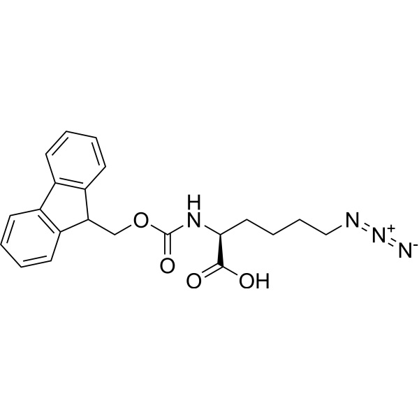 Fmoc-Lys(N3)-OH (CAS : 159610-89-6), Le groupe azido (N3) de la chaîne latérale est stable dans l'acide trifluoroacétique ou la pipéridine. Il peut être facilement converti en amine et en peptides et protéines modifiés par la chaîne latérale de synthèse par la méthodologie de synthèse peptidique en phase solide (SPPS).