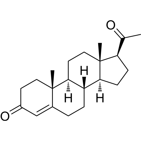 La progestérone (CAS : 57-83-0) est un agent progestatif synthétique similaire à la progestérone endogène utilisée en hormonothérapie ou comme contraceptif féminin. Imitant l'action de la progestérone, le caporate d'hydroxyprogestérone se lie et active les récepteurs nucléaires de la progestérone dans le système reproducteur et provoque la translocation du complexe ligand/récepteur vers le noyau où il se lie aux gènes cibles et favorise leur expression. La progestérone, avec la prégnénolone, est le précurseur biosynthétique de toutes les autres hormones stéroïdes. La progestérone est utilisée comme contraceptif, pour l'aménorrhée, pour le syndrome préménopausique, l'infertilité, les grossesses incomplètes et les saignements utérins anovulatoires.